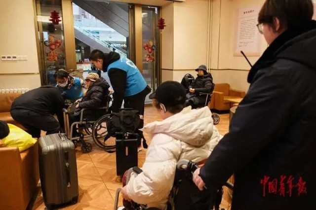 △2月8日,北京站,青年志愿者与乘务员一起协助行动不便的旅客进站乘车。中青报·中青网记者 田嘉硕/摄